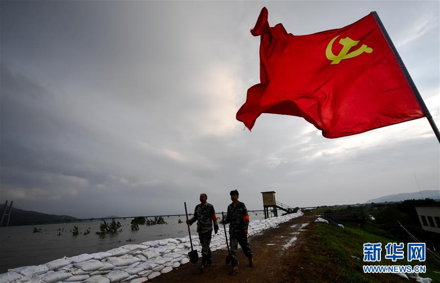 7月19日,陳申桃(右)在圩堤上值守。新華社記者胡晨歡攝