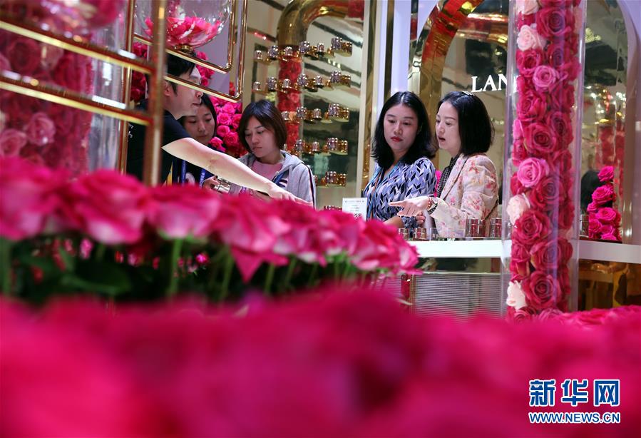 參觀者在第二屆進博會品質(zhì)生活展區(qū)一家化妝品展臺參觀(2019年11月6日攝)。新華社記者 劉穎 攝