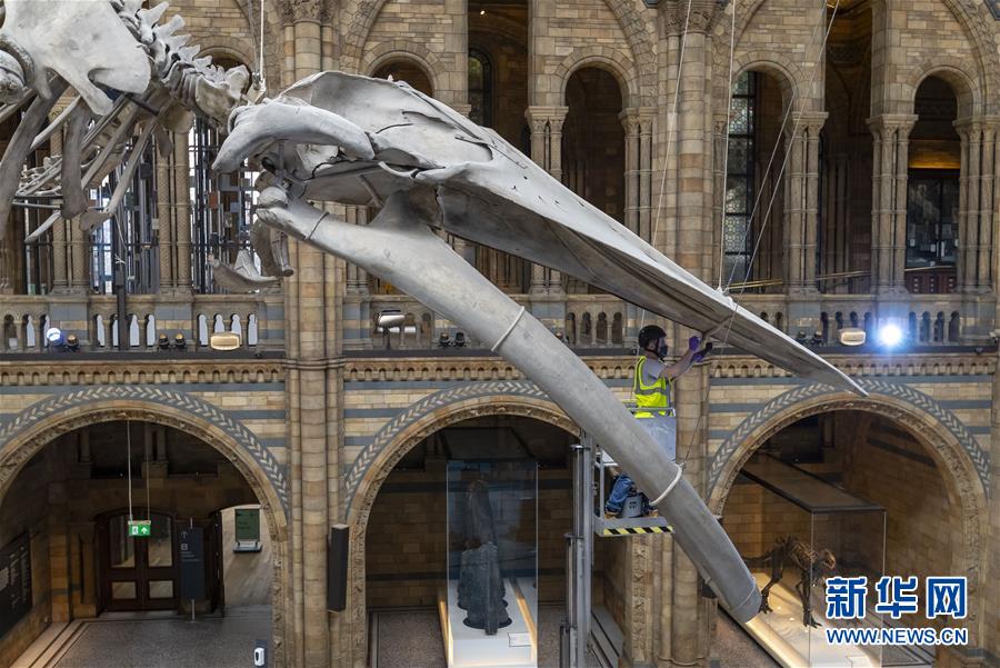 7月27日,工作人員在英國(guó)倫敦的自然歷史博物館大廳內(nèi)清潔一具藍(lán)鯨骨架。受新冠疫情影響關(guān)閉數(shù)月的英國(guó)自然歷史博物館將于8月5日重新對(duì)外開放,目前館方正在為重新開放做最后準(zhǔn)備。參觀者需要提前預(yù)約參觀時(shí)段、全程佩戴口罩且保持安全距離。新華社記者韓巖攝