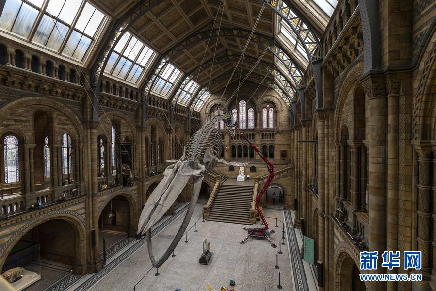 7月27日,工作人員在英國(guó)倫敦的自然歷史博物館大廳內(nèi)清潔一具藍(lán)鯨骨架。受新冠疫情影響關(guān)閉數(shù)月的英國(guó)自然歷史博物館將于8月5日重新對(duì)外開(kāi)放,目前館方正在為重新開(kāi)放做最后準(zhǔn)備。參觀者需要提前預(yù)約參觀時(shí)段、全程佩戴口罩且保持安全距離。新華社記者韓巖攝