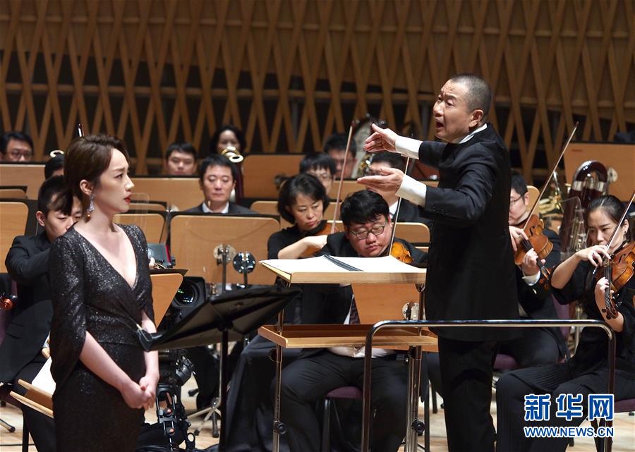 7月29日晚,作曲家譚盾(前右)在2020上海夏季音樂節(jié)閉幕音樂會上指揮。新華社記者任瓏攝