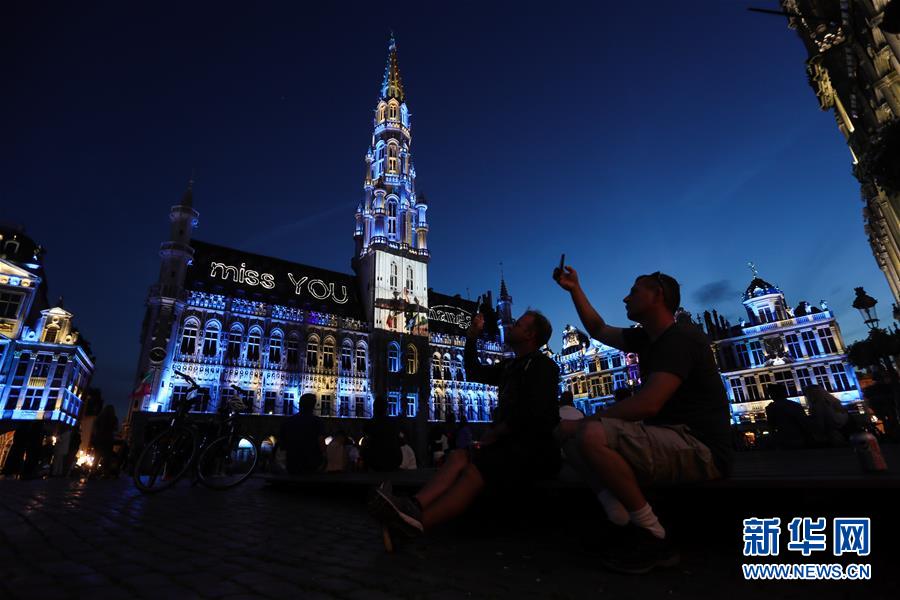 7月29日,比利時布魯塞爾大廣場的市政廳外墻上投射出“想念你,節(jié)日”的字樣。7月29日,比利時布魯塞爾大廣場舉行大型聲光秀。藝術家在市政廳等歷史建筑上投影文字和圖案,紀念這個夏天受新冠疫情影響而不能如期舉辦的文化活動。新華社記者鄭煥松攝