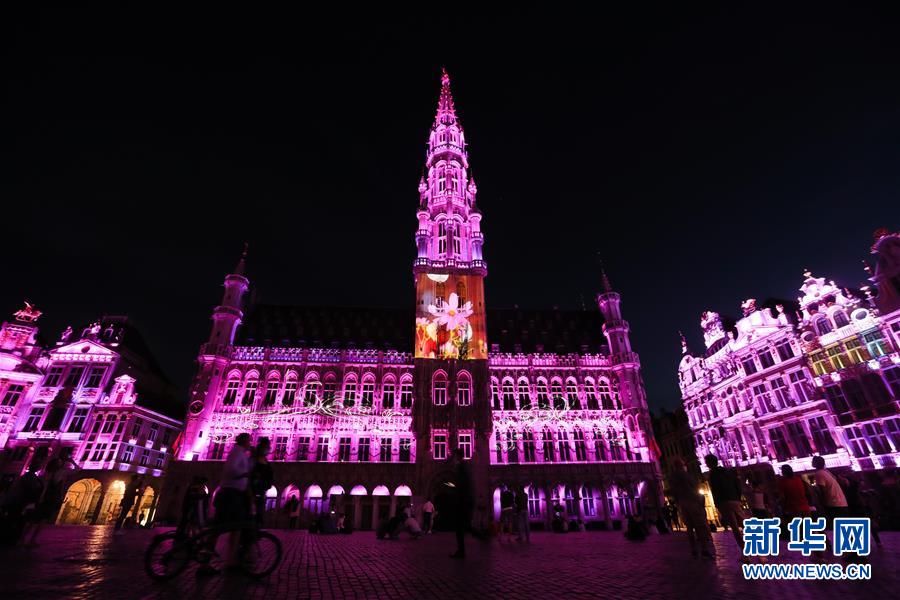 7月29日,人們?cè)诒壤麜r(shí)布魯塞爾大廣場欣賞聲光秀,市政廳外墻上投射出鮮花地毯主題的圖案。7月29日,比利時(shí)布魯塞爾大廣場舉行大型聲光秀。藝術(shù)家在市政廳等歷史建筑上投影文字和圖案,紀(jì)念這個(gè)夏天受新冠疫情影響而不能如期舉辦的文化活動(dòng)。新華社記者鄭煥松攝