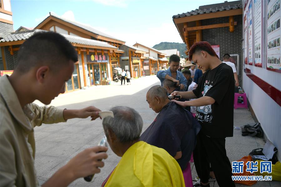 志愿者在柏楊林易地扶貧搬遷安置點(diǎn)為老人免費(fèi)理發(fā)(8月3日攝)。貴州省畢節(jié)市七星關(guān)區(qū)柏楊林易地扶貧搬遷安置點(diǎn)是畢節(jié)市最大的易地扶貧搬遷安置點(diǎn),總面積約1.1平方公里,從2017年開始至今,共有34個鄉(xiāng)鎮(zhèn)6372戶29001人安置到位。如今,安置點(diǎn)內(nèi)教育、醫(yī)療、就業(yè)扶貧車間、長幼日間托養(yǎng)照料中心等設(shè)施齊全,搬遷群眾在這里過上了安居樂業(yè)的幸福生活。新華社記者金良快攝