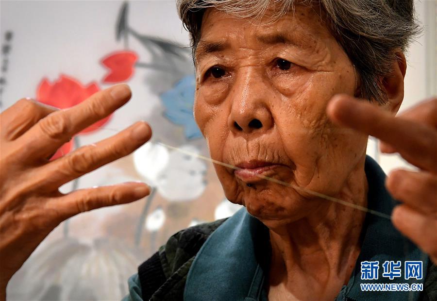 在開封市素花宋繡工藝有限公司的展示館里,王素花在劈線(7月30日攝)。新華社記者李安攝