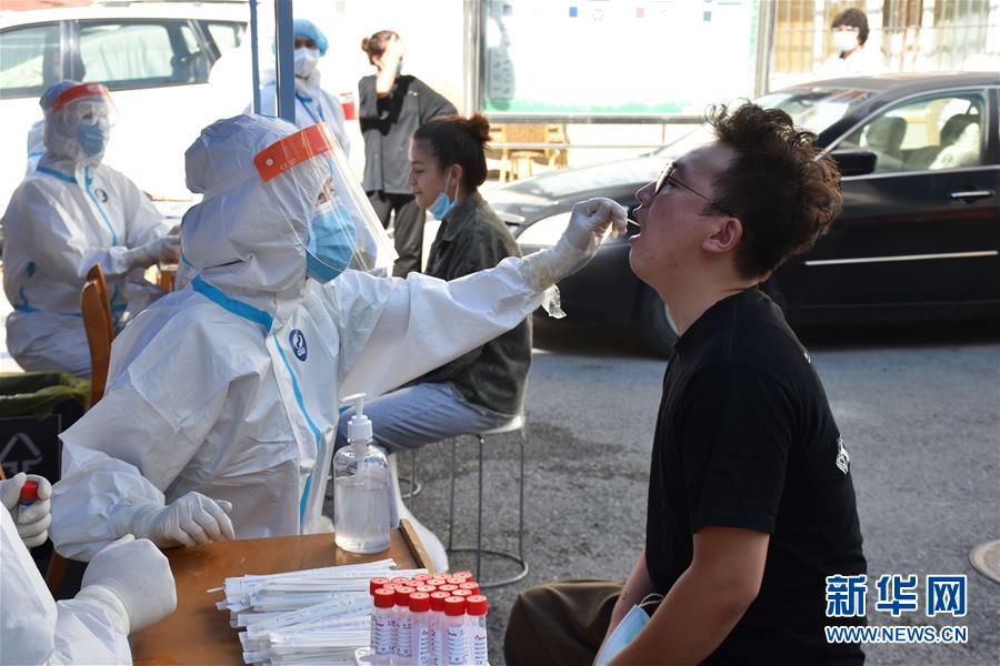 8月5日,醫(yī)務(wù)工作者在烏魯木齊市天山區(qū)山西巷社區(qū),對(duì)居民開(kāi)展免費(fèi)核酸檢測(cè)服務(wù)。新華社記者高晗攝