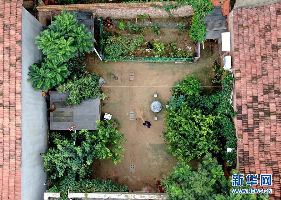 8月5日,王曉楠與父親在自家庭院內勞作(無人機照片)。新華社記者郝源攝