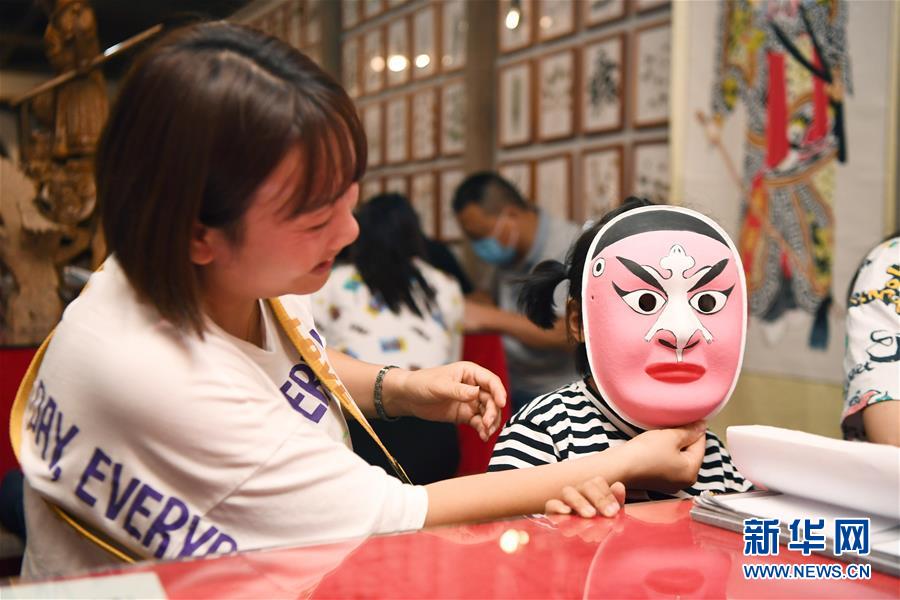 8月8日,小朋友在長沙市非物質(zhì)文化遺產(chǎn)展示館試戴湘劇臉譜。新華社記者 薛宇舸 攝