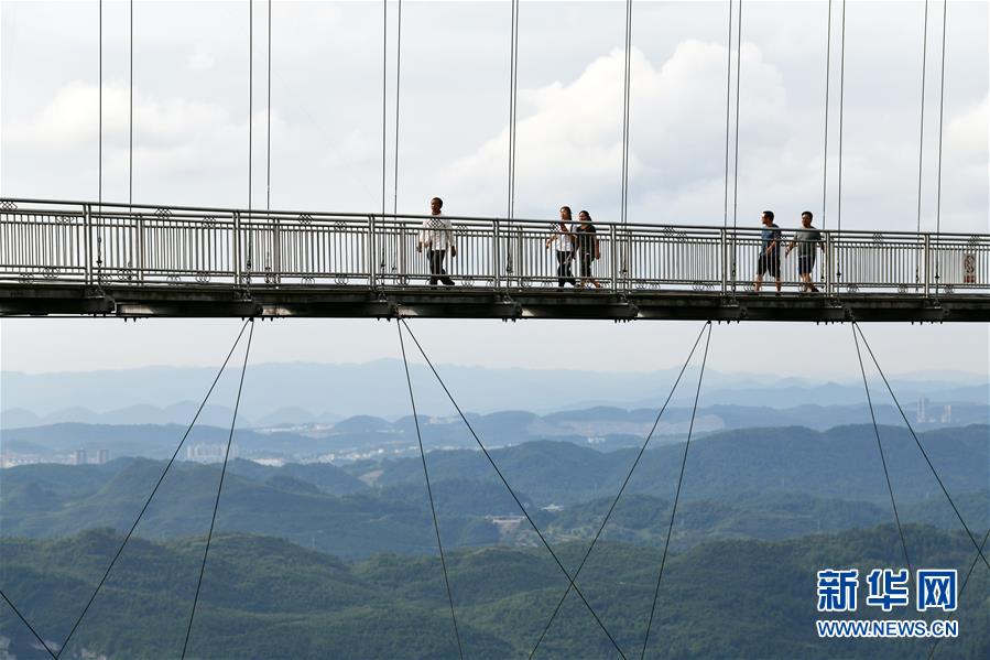 8月8日,游客在貴州省龍里油畫(huà)大草原的吊橋上觀光。近日,貴州省黔南布依族苗族自治州龍里縣境內(nèi)氣候宜人,龍里油畫(huà)大草原、“龍門(mén)鎮(zhèn)”武俠文化主題景區(qū)等景點(diǎn)吸引眾多游客前來(lái)觀光旅游。新華社記者楊文斌攝。