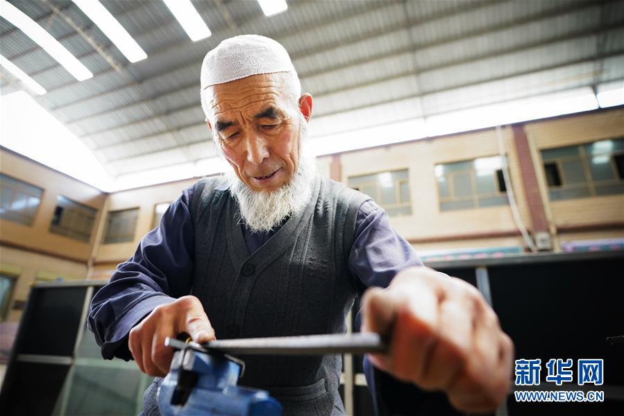 8月10日,甘肅省臨夏回族自治州積石山縣大河家鎮(zhèn)的村民在制作保安腰刀。新華社記者邢廣利攝。