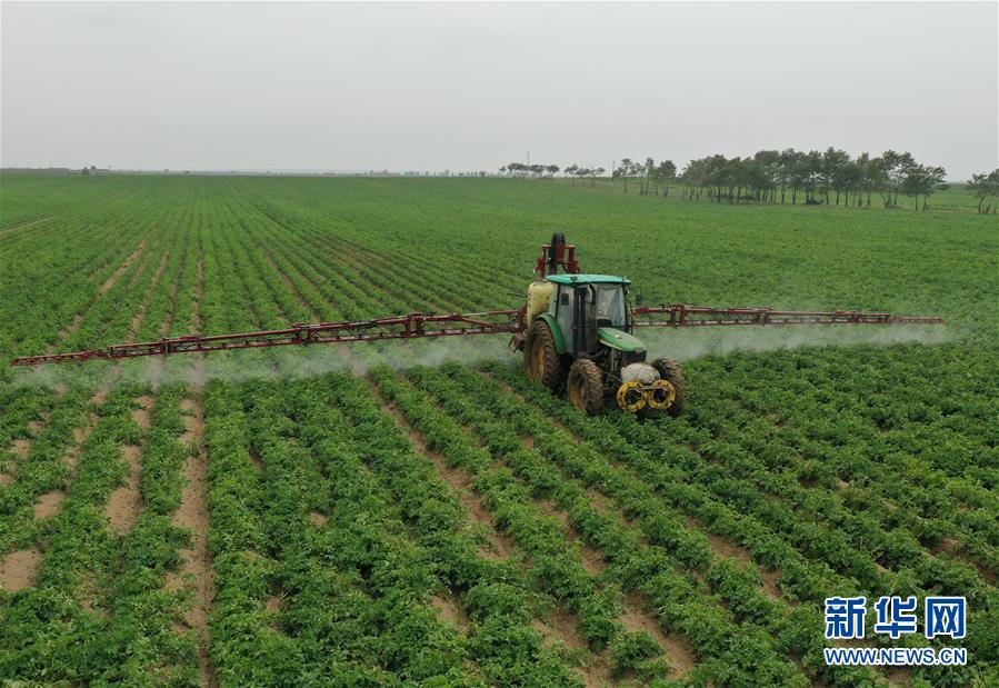 8月12日,在尚義縣三工地鎮(zhèn)有德元村,農民使用機械設備在田間給旱作馬鈴薯噴灑農藥(無人機照片)。
