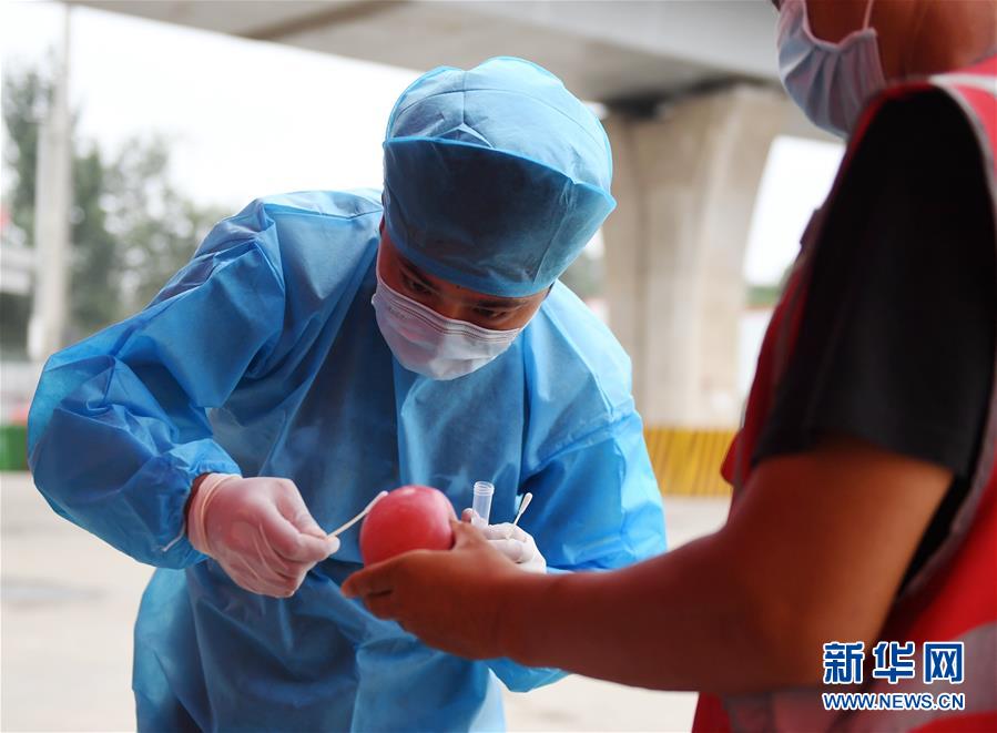 工作人員在新發(fā)地批發(fā)市場周轉(zhuǎn)新區(qū)對進(jìn)場車輛進(jìn)行取樣(8月6日攝)。 新華社記者 張晨霖 攝