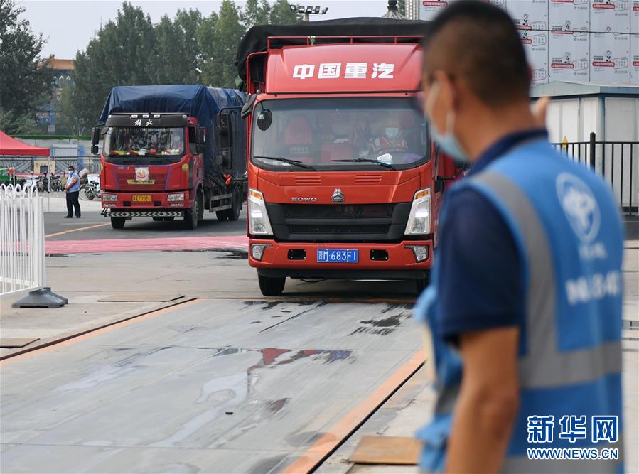進(jìn)場車輛進(jìn)入新發(fā)地批發(fā)市場周轉(zhuǎn)新區(qū)(8月6日攝)。 新華社記者 張晨霖 攝