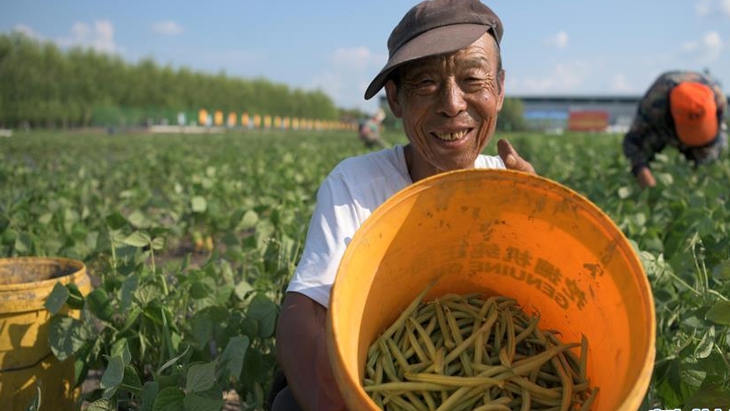 7月14日,在克東縣昌盛鄉(xiāng)青刀豆蔬菜種植示范基地,昌盛鄉(xiāng)安全村脫貧戶(hù)丁紹興展示剛摘下的青刀豆。