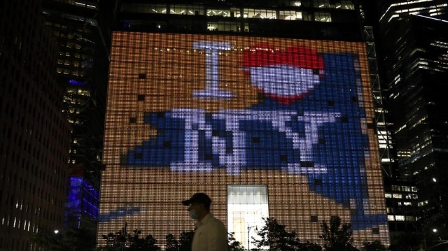 紐約州多處建筑點亮藍(lán)色和金色燈光,及用燈光效果呈現(xiàn)出“紐約堅強”、“我愛紐約”等字樣,致敬紐約民眾團結(jié)抗擊疫情。