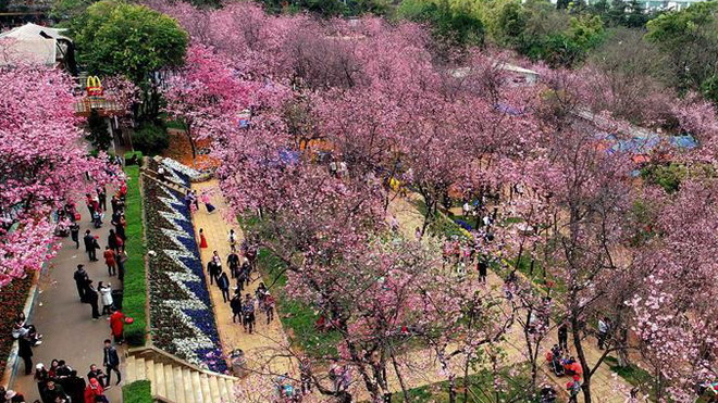 昆明櫻花盛開 游人紛至沓來