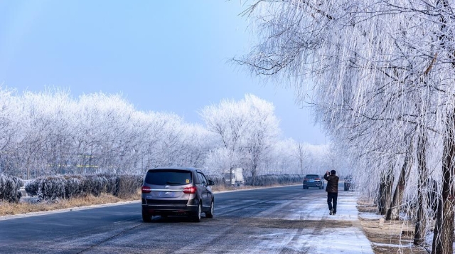 1月13日,107國(guó)道河北省定州路段出現(xiàn)霧凇(樹(shù)掛)景觀,吸引路人駐足拍照留念。