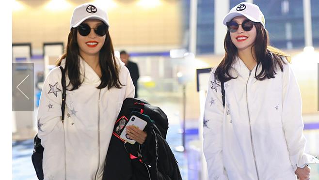 11月29日,上海,秦嵐現(xiàn)身機場。她戴白色鴨舌帽,穿白色星星圖案外套配微喇牛仔褲,架黑超涂紅唇笑靨如花。