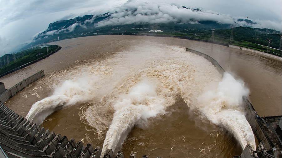 2020年7月2日,湖北宜昌,長(zhǎng)江三峽樞紐開(kāi)啟泄洪深孔泄洪。
