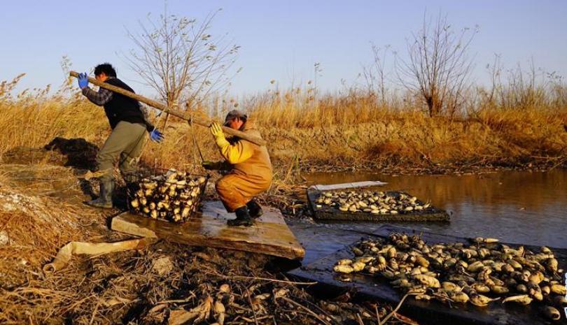 初冬時節(jié),河北省唐山市曹妃甸蓮藕豐收,工人們在結(jié)冰之前忙著采收蓮藕。
