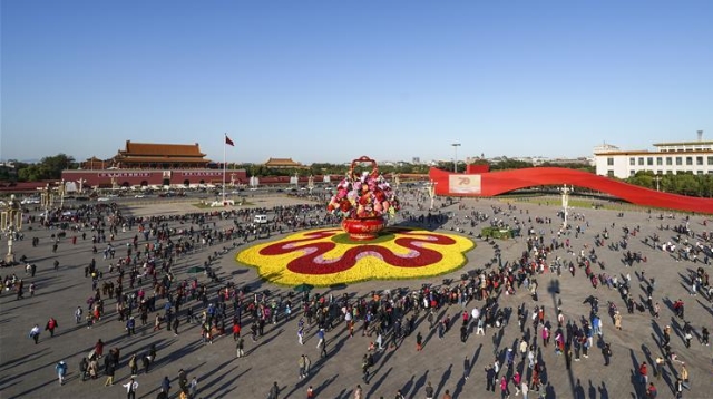 10月14日,以“花果籃”為主造型的天安門廣場中心花壇吸引了眾多游客參觀拍照?!盎ü@”的夜景更是流光溢彩,絢爛迷人。