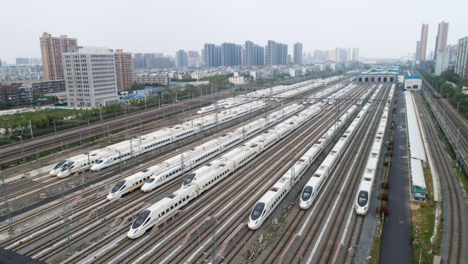 2020年4月6日,武漢動(dòng)車段高鐵動(dòng)車組整裝待發(fā)(無人機(jī)照片)。