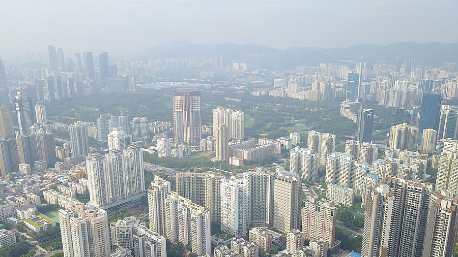 8月30日下午,記者通過無人機的視角看到,福田區(qū)許多地標(biāo)性建筑物在灰霾的籠罩下顯得“猶抱琵琶半遮面”,不能以“全面目”示人。