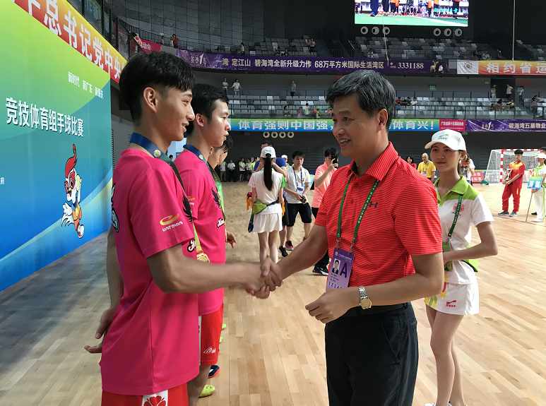 深圳新聞網訊 繼20日結束的高爾夫球賽奪冠后,深圳代表隊在廣東省運會再下一金。7月21日,在為期5天的肇慶男子青少年組手球比賽中,深圳手球隊以35∶29打敗廣州隊奪得了冠軍,這是深圳男子手球隊在省運會上獲得的第一個五連冠,也是深圳代表團獲得的第一個集體項目金牌。深圳文體旅游局副局長韓星元現(xiàn)場為深圳男子青少年手球隊頒發(fā)金牌。