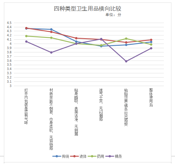 本次衛(wèi)生巾比較試驗(yàn)共招募150名目前沒(méi)有從事有關(guān)衛(wèi)生巾行業(yè)的年齡介于16-45歲之間的消費(fèi)者分別對(duì)傳統(tǒng)型衛(wèi)生巾、新型衛(wèi)生巾(液體材料衛(wèi)生巾)、衛(wèi)生棉條、功能性(藥用)衛(wèi)生巾四種類型商品進(jìn)行體驗(yàn)。要求體驗(yàn)消費(fèi)者對(duì)所使用的衛(wèi)生用品進(jìn)行1-5分的評(píng)價(jià)(1分最低,5分最高),主要體驗(yàn)內(nèi)容及感受如下: