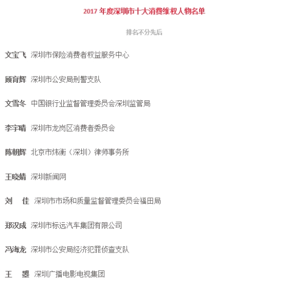 2017年度深圳市十大最美消費(fèi)維權(quán)人物出爐