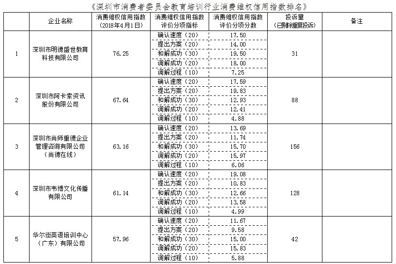 在本次公布的教育培訓(xùn)行業(yè)消費(fèi)維權(quán)信用指數(shù)排名中,深圳市明德盛世教育科技有限公司的消費(fèi)維權(quán)信用指數(shù)為76.25,排名第一,其2017年4月1日至2018年3月31日期間的投訴量為31宗;坤澤教育(深圳)有限公司的消費(fèi)維權(quán)信用指數(shù)為14.24,排名第十,其2017年4月1日至2018年3月31日期間的投訴量為42宗。