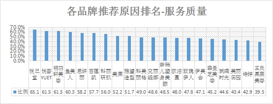 排名第一的是悅己堂,服務質(zhì)量推薦率為65.1%;其次是悅薈YUET 與明羽軒美容,推薦率均為61.5%。