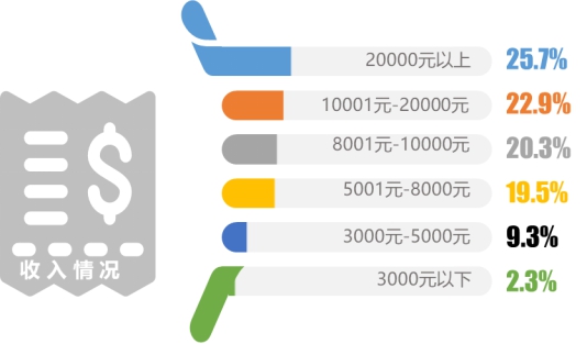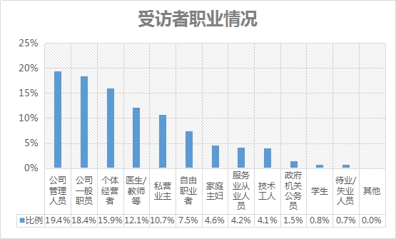 本次調(diào)研中,公司管理人員的比例最高,為19.4%,其次是公司一般職員,占比為18.4%;68.9%的受訪者其個(gè)人月收入超過8000元。