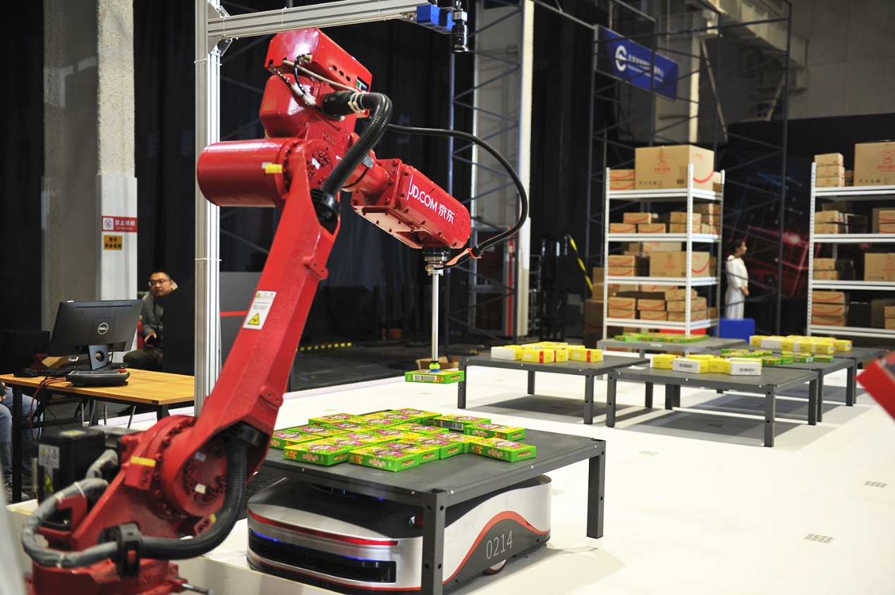 為了展現(xiàn)無人倉的全程智能化流程,本次峰會外展區(qū)設置了智能動態(tài)展區(qū)。在現(xiàn)場,動態(tài)運行的揀選機械臂、自動打包機與飛馬機器人、智能叉車等一起,共同構(gòu)成了京東無人倉強大的倉儲系統(tǒng)。目前在京東智能化倉儲體系內(nèi),智能機器人設備已經(jīng)實現(xiàn)了家用電器、美妝個護、電腦辦公、服飾內(nèi)衣、醫(yī)療保健等五大訂單品類的應用場景覆蓋,通過地狼、天狼、分揀AGV、交叉帶分揀機、AGV叉車、機械臂等12種自主研發(fā)機器人的投用,大大提升了京東的訂單處理效率。