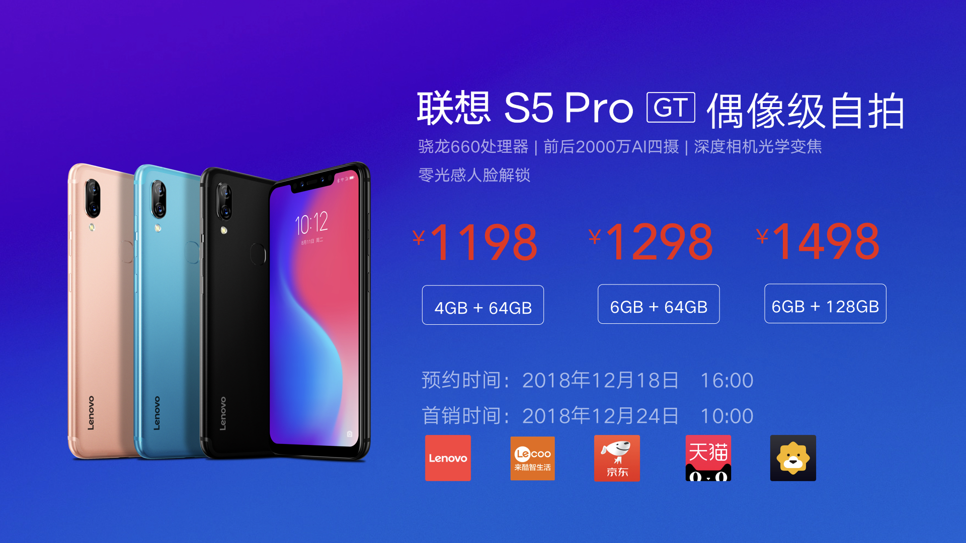 聯(lián)想S5 Pro升級(jí)版,配置升級(jí),美麗升級(jí),售價(jià)4 G+64G為1198元,6 G+64G為1298元,6 G+128G為1498元。12月18日在全平臺(tái)開(kāi)啟預(yù)約,12月24日開(kāi)啟首銷。