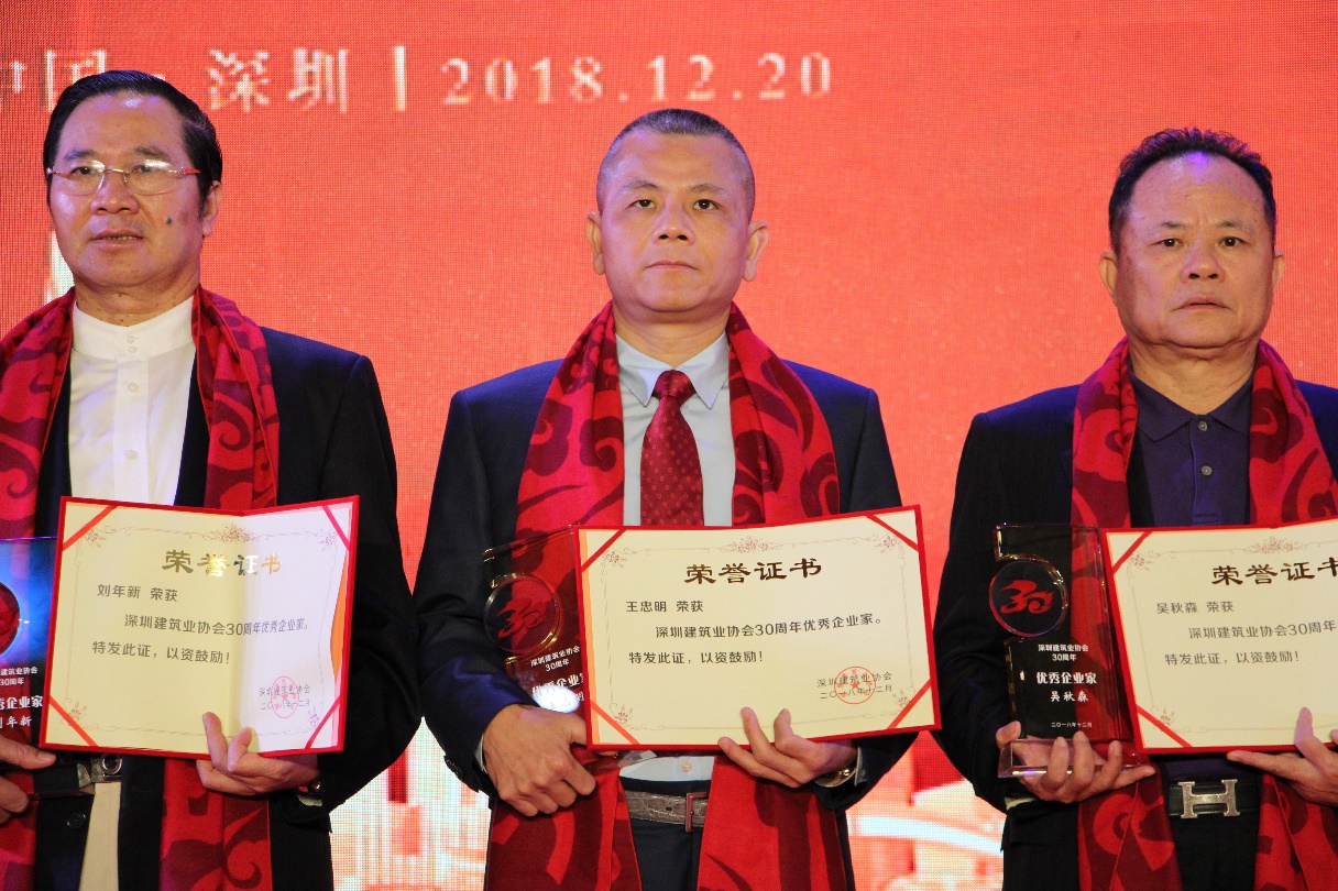 本次慶典上,深圳建筑業(yè)協(xié)會表彰了一批在促進(jìn)、推動深圳建筑行業(yè)發(fā)展中作出重大貢獻(xiàn)的優(yōu)秀企業(yè)和個人,鼓勵他們不斷探索創(chuàng)新,共同創(chuàng)造深圳建筑業(yè)的輝煌。深圳市建被授予“30周年優(yōu)秀施工企業(yè)”;翠林投資集團(tuán)董事長王忠明榮獲深圳建筑業(yè)協(xié)會“30周年優(yōu)秀企業(yè)家”稱號;深圳市建員工盧燦光、郝崇民榮獲“30周年優(yōu)秀項(xiàng)目經(jīng)理”稱號;深圳市建老員工李炳坤榮膺“30周年優(yōu)秀工匠”稱號。