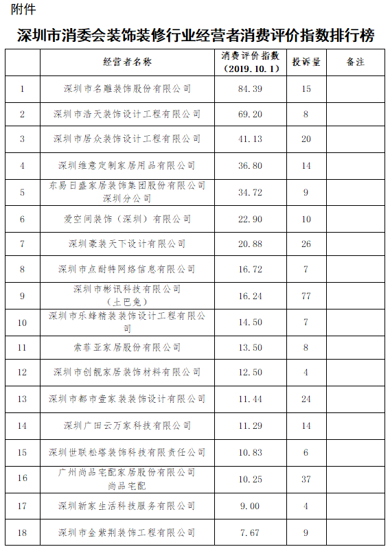 11月20日,深圳市消費(fèi)者委員會(huì)(以下簡(jiǎn)稱(chēng)“深圳市消委會(huì)”)首次發(fā)布深圳市消委會(huì)裝飾裝修行業(yè)消費(fèi)評(píng)價(jià)指數(shù)排行榜。榜單旨在敦促裝飾裝修行業(yè)經(jīng)營(yíng)者提升商品和服務(wù)質(zhì)量,為消費(fèi)者提供裝飾裝修消費(fèi)指引,營(yíng)造安全放心的消費(fèi)環(huán)境。