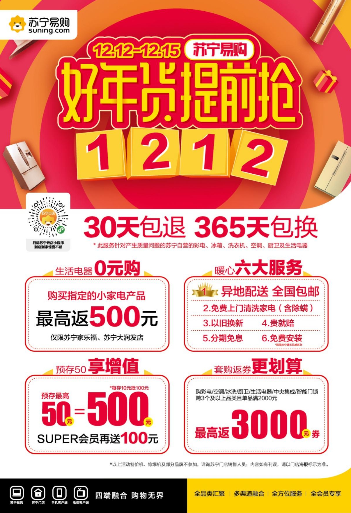 同時,深圳蘇寧還聯(lián)合各大知名品牌為廣大消費者推出了多重超強福利,在活動力度上,預存50元可抵500元的家電購物抵用券,并且套購多個產(chǎn)品最高可返3000元的優(yōu)惠券。除此之外,蘇寧家樂福、蘇寧大潤發(fā)、蘇寧歐尚聯(lián)合推出生活家電0元購活動,消費者購買生活電器可返產(chǎn)品價格的同等金額,最高省500元。并且雙十二當天在蘇鮮生購物使用蘇寧金融支付新用戶滿50元減20元,老用戶滿30元減10元,12月15日在蘇寧小店購物使用翼支付還可享5折立減??梢灶A見,從產(chǎn)品、價格、服務、活動各個方面不斷提升消費者購物體驗的深圳蘇寧將成為消費者選購年貨的不二選擇。(吳艷)