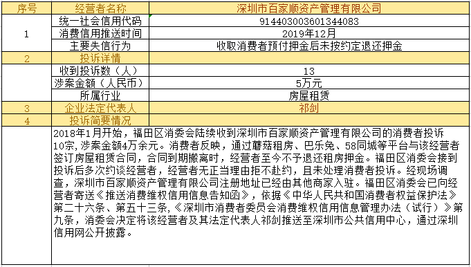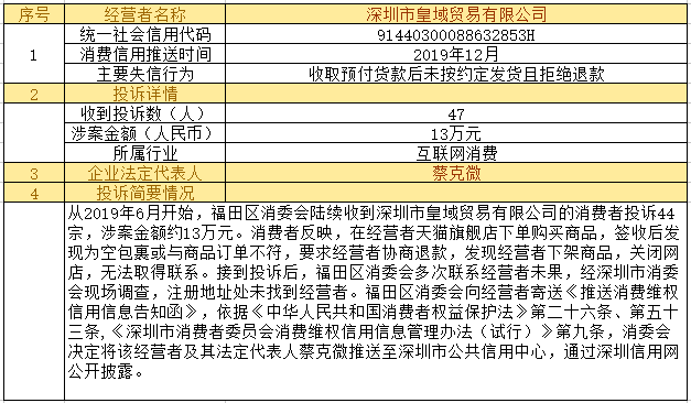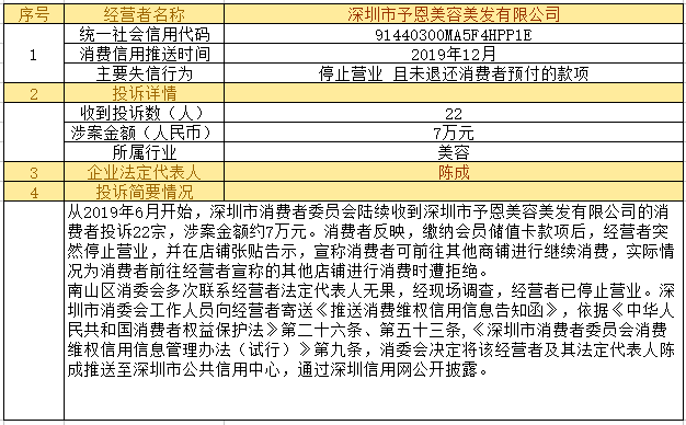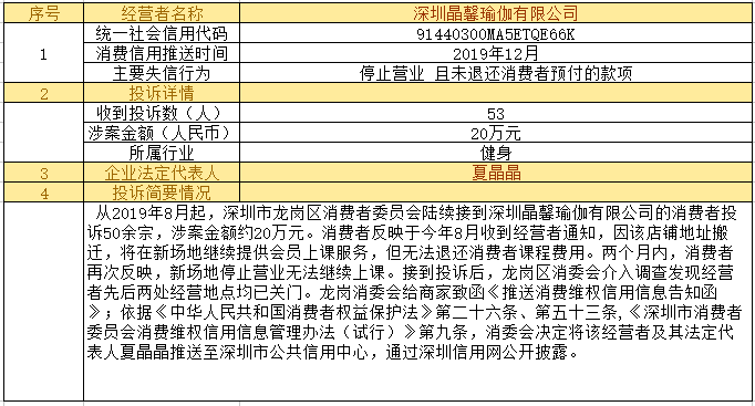 深圳新聞網(wǎng)2019年12月24日訊12月24日,為加強(qiáng)對(duì)商品和服務(wù)的社會(huì)監(jiān)督,推進(jìn)消費(fèi)領(lǐng)域信用體系建設(shè),深圳市消費(fèi)者委員會(huì)(以下簡(jiǎn)稱“深圳市消委會(huì)”)聯(lián)合福田區(qū)消費(fèi)者委員會(huì)(以下簡(jiǎn)稱“福田區(qū)消委會(huì)”)和龍崗區(qū)消費(fèi)者委員會(huì)(以下簡(jiǎn)稱“龍崗區(qū)消委會(huì)”)將深圳豬兼強(qiáng)互聯(lián)網(wǎng)科技有限公司、深圳市皇域貿(mào)易有限公司、深圳市百家順資產(chǎn)管理有限公司、深圳市予恩美容美發(fā)有限公司、深圳晶馨瑜伽有限公司等五家預(yù)付式和互聯(lián)網(wǎng)消費(fèi)領(lǐng)域停止?fàn)I業(yè)且未退還消費(fèi)者預(yù)付款項(xiàng)的經(jīng)營者及其主要負(fù)責(zé)人推送至深圳市公共信用中心,通過深圳信用網(wǎng)公開披露。