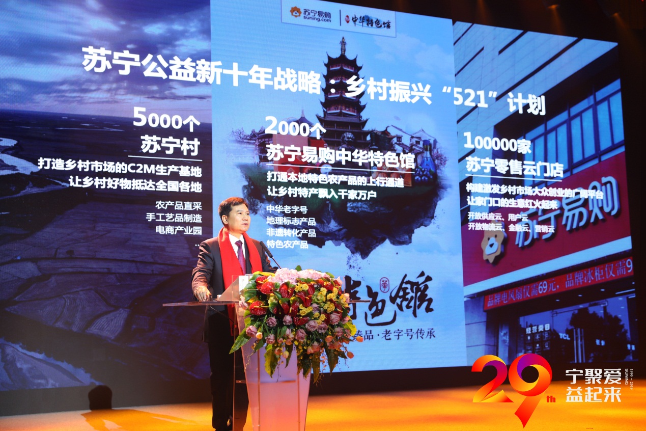 在12月26日舉行的“蘇寧29周年公益慶生儀式暨新十年公益戰(zhàn)略發(fā)布會”上,蘇寧控股集團董事長張近東發(fā)布了蘇寧鄉(xiāng)村振興“521計劃”,中華特色館是其中重要部分,未來十年要達到2000個。同時,蘇寧村將會建設(shè)至5000個,蘇寧易購零售云門店則將要開到10萬家。