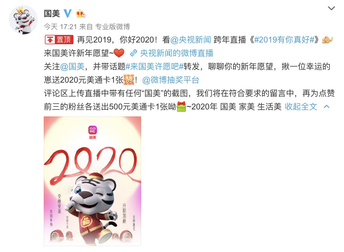 今年是國美首次聯(lián)合央視新聞跨年直播,為實現(xiàn)廣大國美用戶的心愿,回饋消費者。國美還在微博啟動多個有獎轉(zhuǎn)發(fā)活動,獎品為面值200元、500元、2020元的國美美通卡,如果沒有趕上央視新聞的跨年直播,還可在國美官方微博參與抽獎,新的一年有好的開始,沒準下個錦鯉就是你!(常軍平)