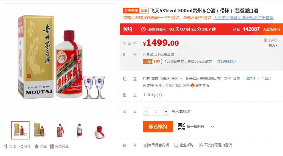 買(mǎi)年貨上蘇寧,買(mǎi)好酒上蘇寧。要說(shuō)年貨節(jié)期間,蘇寧超市酒水類(lèi)目的明星產(chǎn)品,還要屬1499元的飛天茅臺(tái)酒。年貨節(jié)期間,蘇寧已經(jīng)啟動(dòng)了多輪的飛天茅臺(tái)酒的預(yù)約搶購(gòu),而1月10日即將迎來(lái)新一輪的搶購(gòu)。截至1月8日上午10點(diǎn)多,已經(jīng)有超過(guò)14萬(wàn)實(shí)名認(rèn)證super會(huì)員參與了本次預(yù)約。