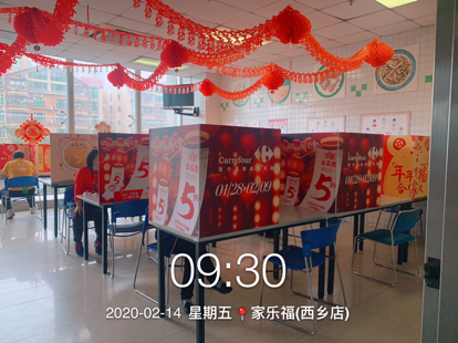 蘇寧家樂福還安排了保潔員每天對(duì)員工餐廳按三餐進(jìn)行清潔,使用稀釋的84消毒液浸泡抹布對(duì)桌椅進(jìn)行擦拭。其次,在餐廳放置免洗消毒凝膠,供員工用餐前清潔使用。再次,要求員工分時(shí)段用餐,自帶餐盒餐具盛飯;每個(gè)人在餐廳內(nèi)用餐是也要與他人保持一定距離,并用簡(jiǎn)易卡板隔開。