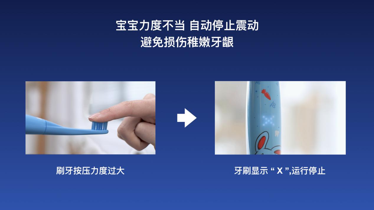 S7000K智能音樂兒童電動(dòng)牙刷還支持自動(dòng)過壓降頻保護(hù),當(dāng)孩子在刷牙力度過大時(shí),該功能就會(huì)啟動(dòng),自動(dòng)停止振動(dòng),屏幕LED還會(huì)顯示出X型警告,保護(hù)孩子稚嫩的牙齦及牙釉質(zhì)。