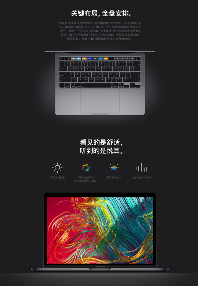 從細(xì)節(jié)來(lái)看,新款13英寸MacBook Pro輕盈纖薄,僅重1.4千克,厚度15.6毫米。還是"隨身的實(shí)力派",圖片處理速度最高可提升80%多,最高可選配32GB3733MHz內(nèi)存,最高可選配4TB固態(tài)硬盤。讓人心動(dòng)的是可實(shí)現(xiàn)"關(guān)鍵布局,全盤安排":內(nèi)置妙控鍵盤采用優(yōu)化的1毫米鍵程剪刀式結(jié)構(gòu),帶來(lái)靈敏舒適又安靜的輸入體驗(yàn);獨(dú)立的Esc鍵,便于你快速切換各種模式和視圖;呈倒T形排列的方向鍵,讓你輕松操縱各類游戲和表格;此外,觸控欄會(huì)整理好各種使用的快捷鍵,為你放置在醒目的居中位置;而觸控ID則能助你快速實(shí)現(xiàn)身份驗(yàn)證。