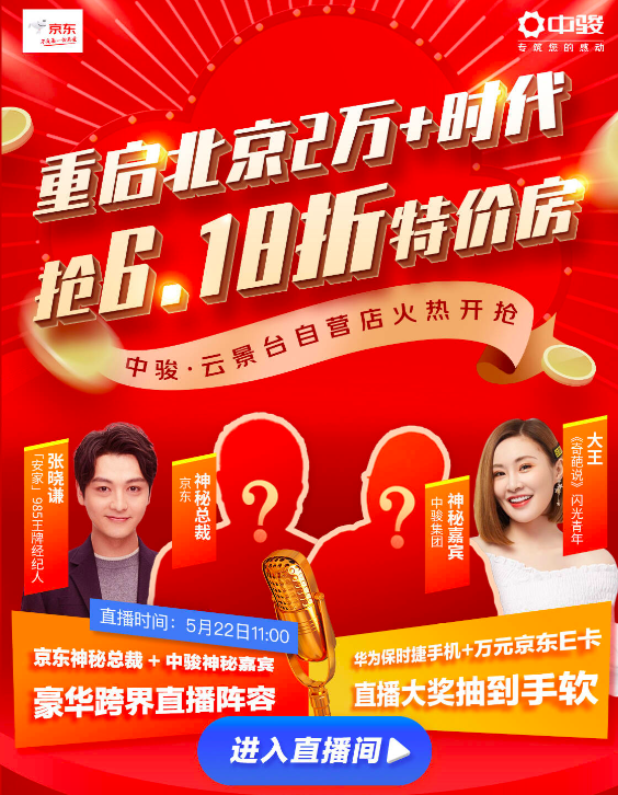 值得關(guān)注的是,中國內(nèi)地男演員張曉謙、奇葩說選手大王、以及京東和中駿的兩位“神秘嘉賓”還將在5月22日上午11點(diǎn)帶來直播,在線預(yù)售全新房源,并將一套6.18折的特價(jià)房開展618抽獎(jiǎng)活動,優(yōu)惠后僅需一百多萬元即可拿下一套北京新房。