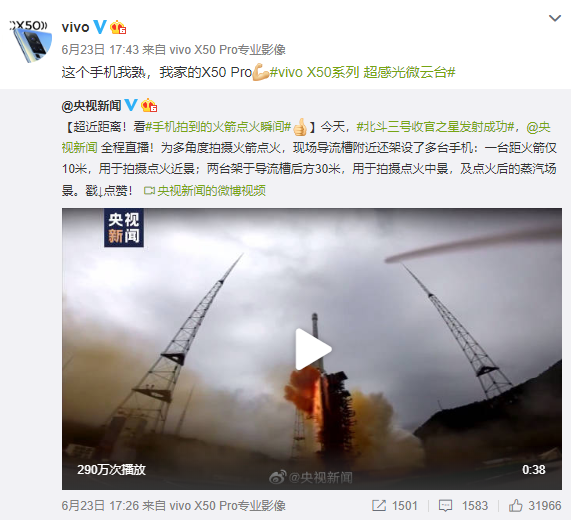 見圳客戶端 ·深圳新聞網(wǎng)2020年6月28日訊 北斗系統(tǒng)第五十五顆導(dǎo)航衛(wèi)星暨北斗三號(hào)最后一顆全球組網(wǎng)衛(wèi)星,6月23日9時(shí)43分成功發(fā)射。為了多角度拍攝火箭點(diǎn)火,央視新聞在導(dǎo)流槽附近架設(shè)多臺(tái)vivo X50 Pro手機(jī),一臺(tái)位于導(dǎo)流槽旁邊,距離火箭10米的位置,用于拍攝點(diǎn)火近景;兩臺(tái)架設(shè)在導(dǎo)流槽后方30米的距離,用于拍攝點(diǎn)火中景,以及點(diǎn)火后的蒸汽場(chǎng)景。