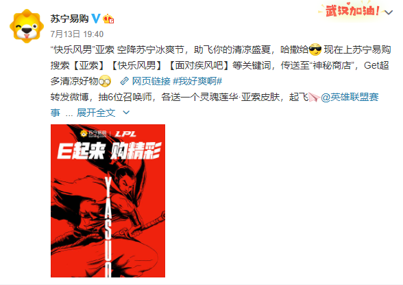 見圳客戶端·深圳新聞網(wǎng)2020年7月14日訊 昨日,蘇寧易購官方微博發(fā)布消息稱,LPL代言人亞索亮相蘇寧冰爽節(jié),將和蘇寧“E起”為廣大用戶及粉絲創(chuàng)造快樂。打開蘇寧并搜索“亞索”、“快樂風(fēng)男”或“面對(duì)疾風(fēng)吧”,均可進(jìn)入冰爽節(jié)亞索主題會(huì)場(chǎng),領(lǐng)取召喚師福利。