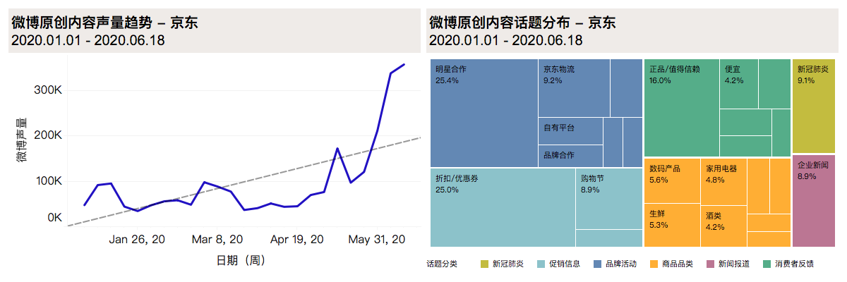 6月與疫情相關(guān)的話(huà)題內(nèi)容已降至全部話(huà)題的3%,表明用戶(hù)對(duì)疫情的關(guān)心已逐漸轉(zhuǎn)回到京東平臺(tái)核心功能上,即平臺(tái)的電商本質(zhì)。在用戶(hù)體驗(yàn)方面的反饋中,提及“京東值得信賴(lài)”的內(nèi)容占比近45%。京東在疫情爆發(fā)期間包括物資捐贈(zèng),醫(yī)療物資運(yùn)輸?shù)仍趦?nèi)的舉措使京東得到了社交媒體用戶(hù)的肯定與贊揚(yáng)。在618購(gòu)物節(jié)開(kāi)始后,用戶(hù)對(duì)京東平臺(tái)的討論也更多集中在“平臺(tái)大”、“信得過(guò)”等方面。