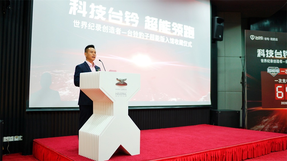 深圳市工業(yè)展覽館副館長潘文峰,深圳電動車產(chǎn)業(yè)促進(jìn)委員會執(zhí)行會長楊華,臺鈴集團(tuán)董事長孫木鉗、臺鈴集團(tuán)總裁助理兼公關(guān)總監(jiān)胡東文等嘉賓齊聚深圳市工業(yè)展覽館,參加了以“科技臺鈴超能領(lǐng)跑”為主題的世界紀(jì)錄創(chuàng)造者——臺鈴豹子超能版入館收藏儀式,共同見證了這一榮光時刻。